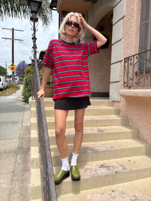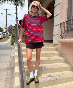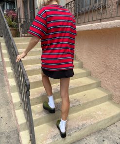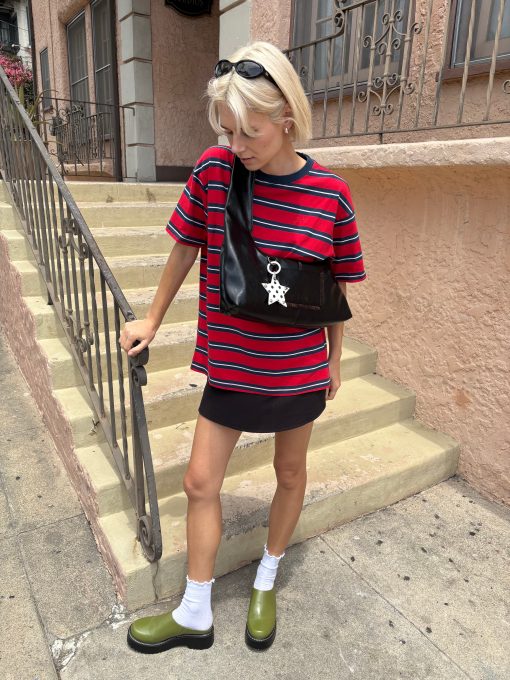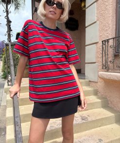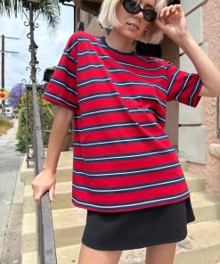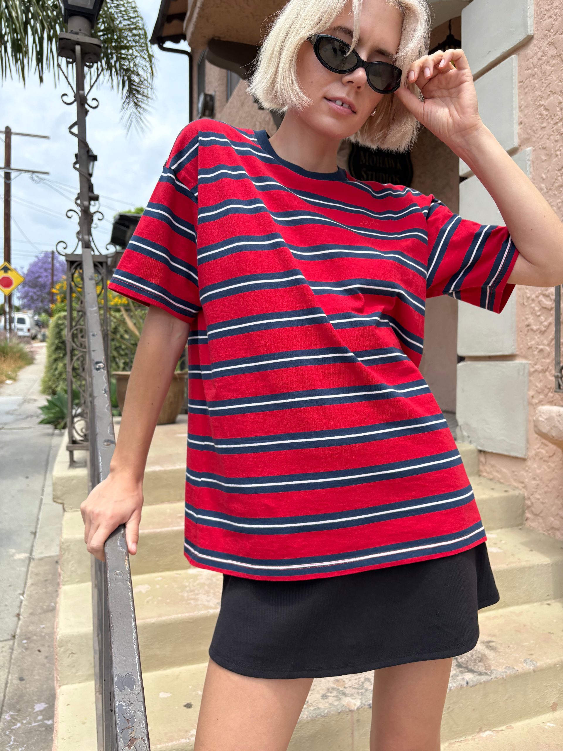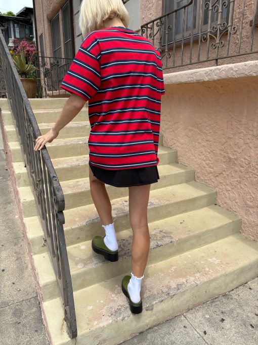 The Ariel Shrunken Tee in in Red and Navy Stripe is made from 100% organic cotton with a red ‘DM’ logo on the front. It has a fitted shape, short sleeves, and a playful feel that’s easy to wear every day. Fits true to size.