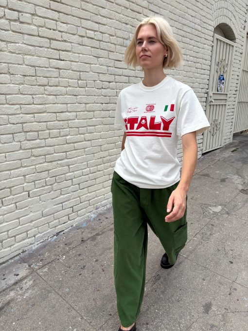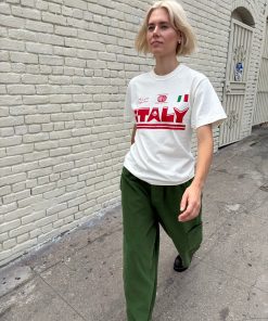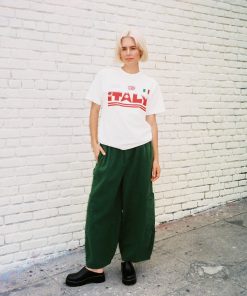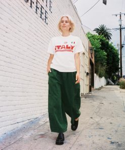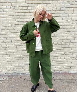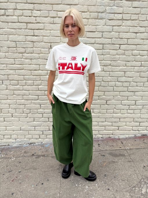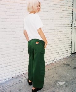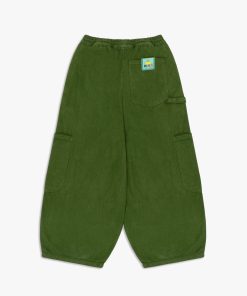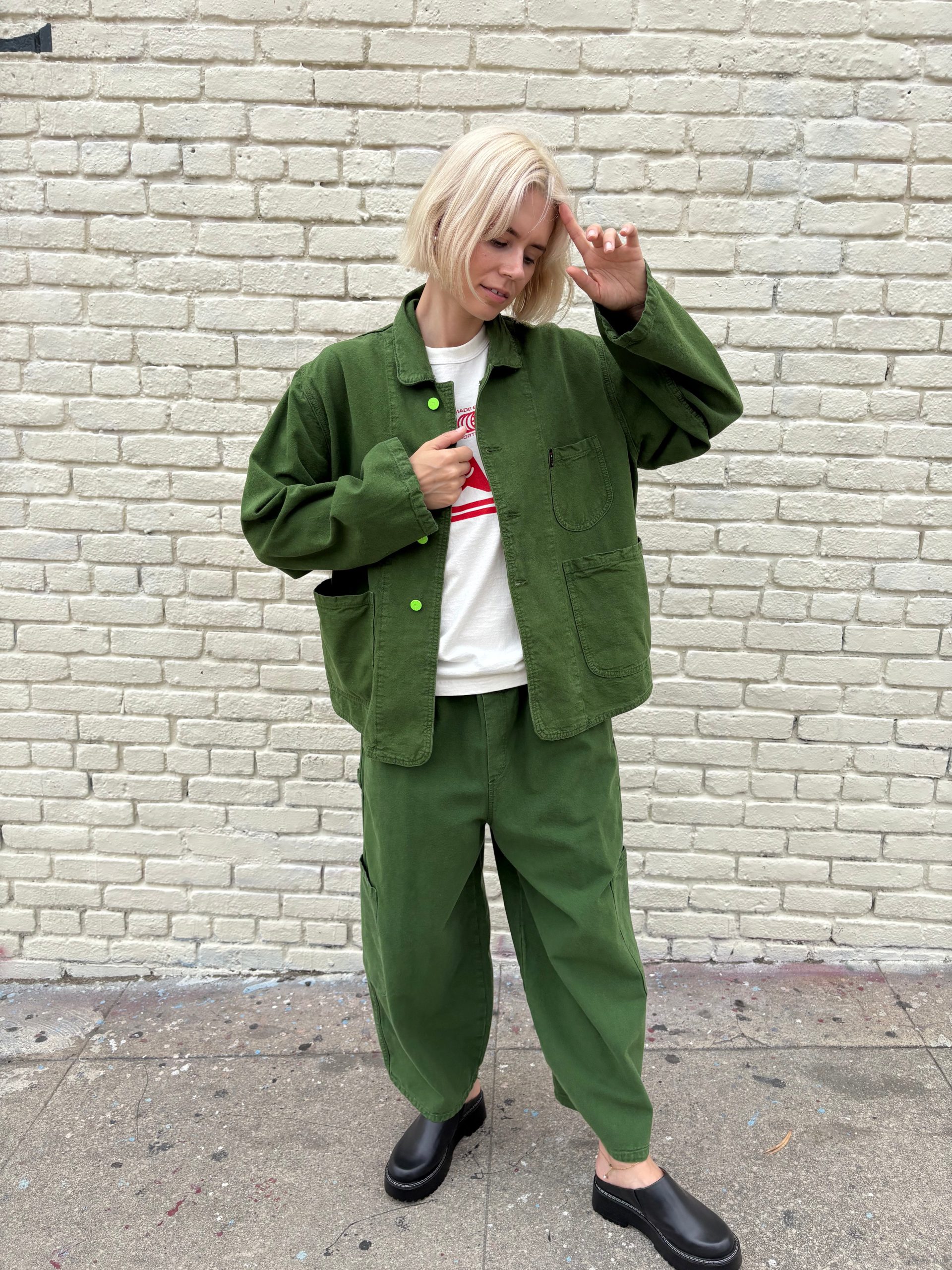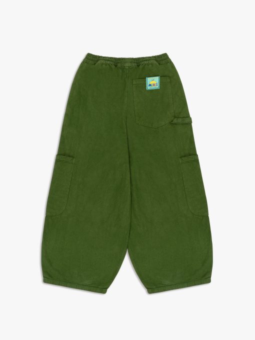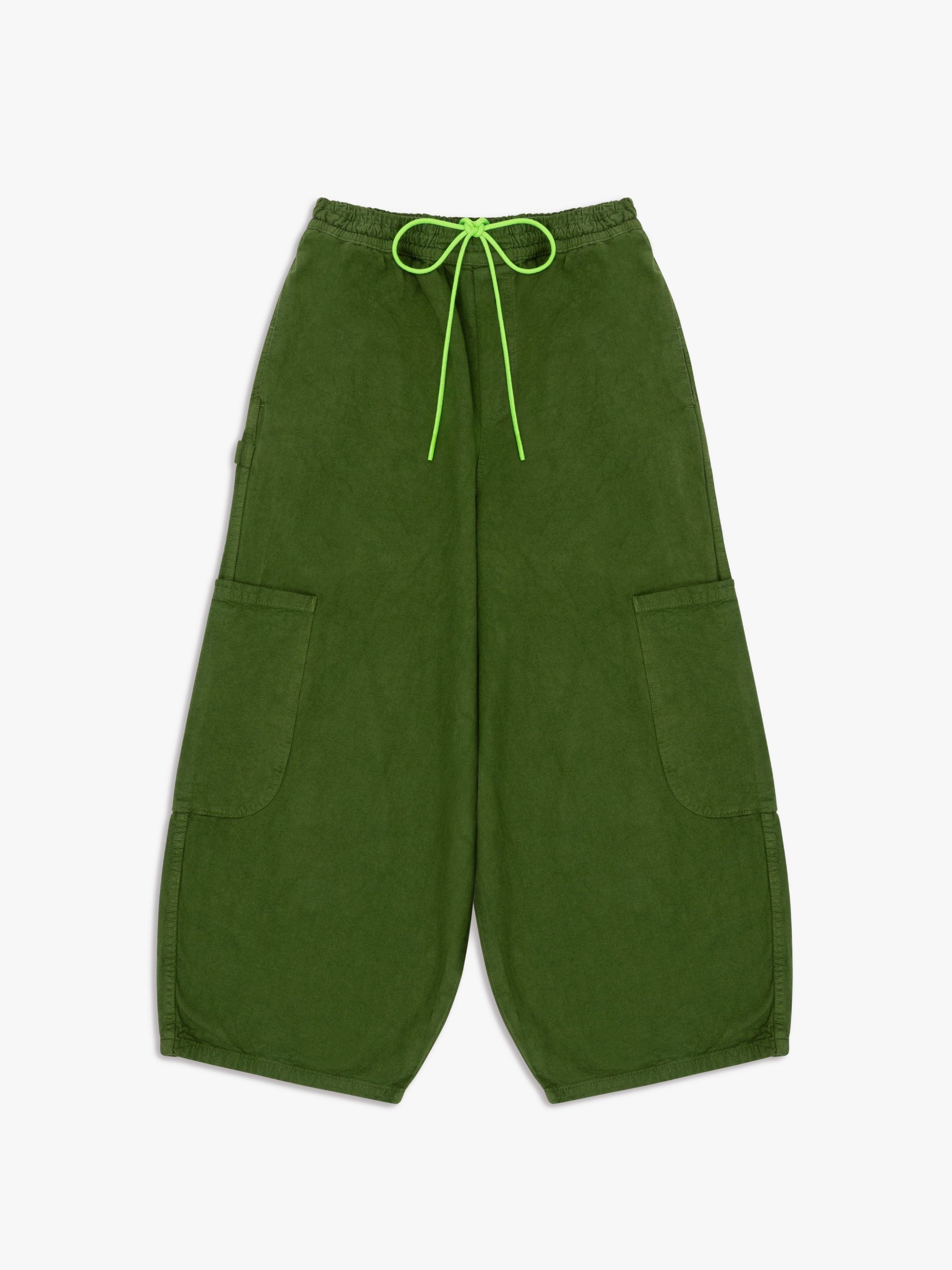 Wide leg baggy pant made out of a 100% cotton canvas featured in a kale green color with a neon green drawstring at the waist for a versatile fit. Features plenty of large pockets.