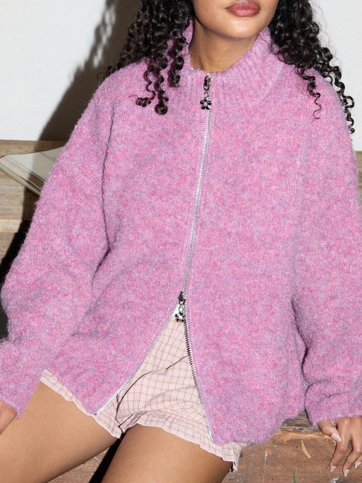 Slightly oversized soft wool blend double zip-up sweater with a flower zipper pull.50% Recycled Polyester, 20% Acrylic, 18% Nylon, 10% WoolDry clean only