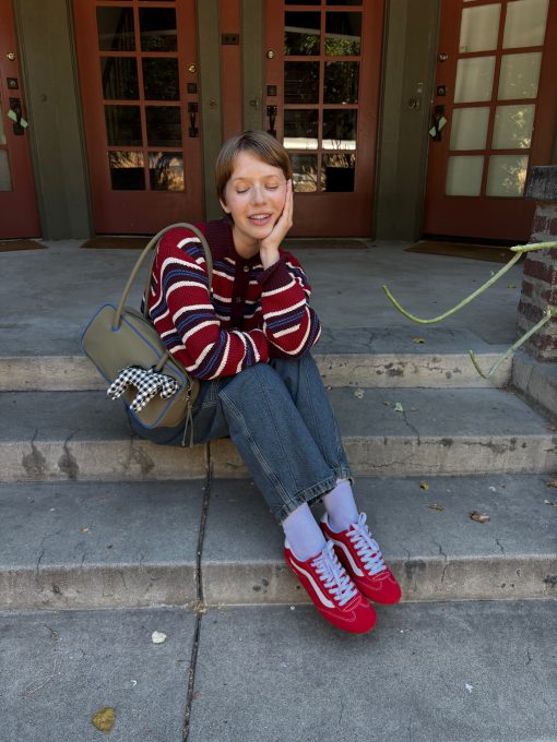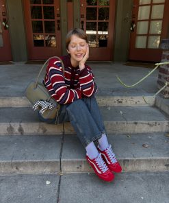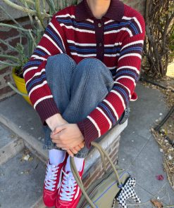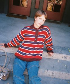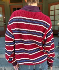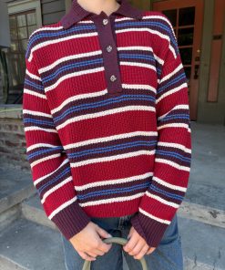 Rugby style sweater featured in a red, blue, and burgundy stripe featuring a front button down placket and an embroidered ‘DM’ logo.