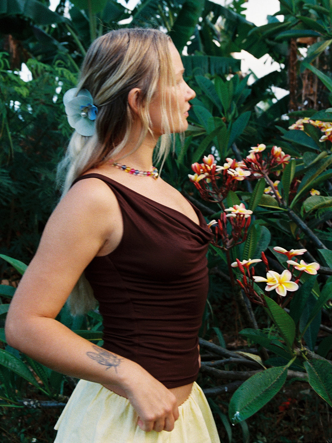 Knit top with a cowl neckline featured in a chocolate brown. This top cinches at the waist for a fitted look. This stretchy knit fabric is comfortable and accounts for about 2-3in of stretch all around.