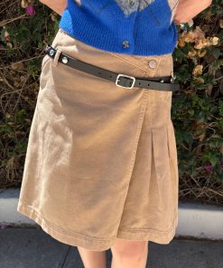 Kilt style denim skirt with side pockets, a pleated detail on the side, and a removable belt. This skirt fits knee-length and is unlined.