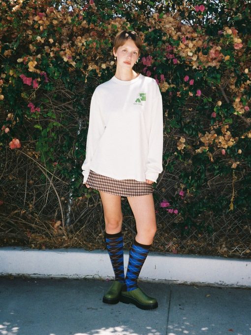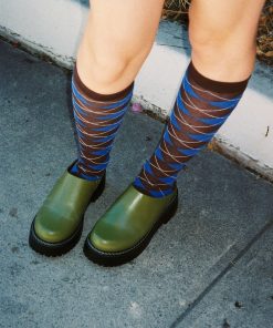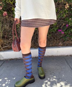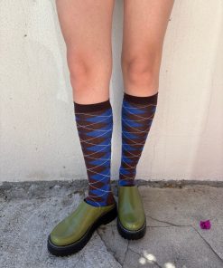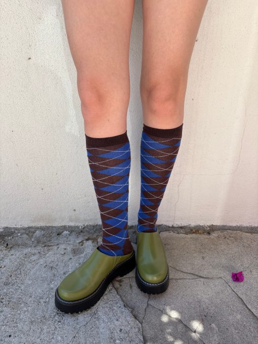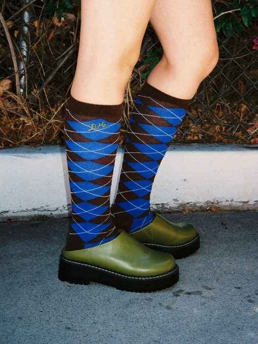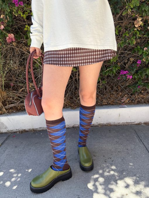 These knee-length socks feature a classic blue and chocolate argyle design, with a touch of pink DM embroidery for a playful finish. Made from a soft cotton blend, they’re the perfect mix of comfort and style.