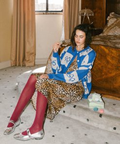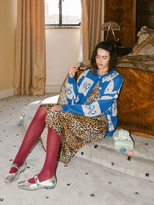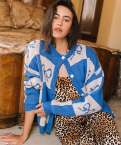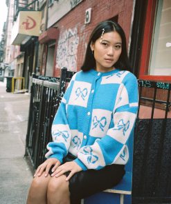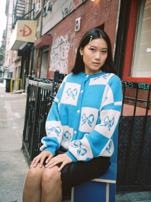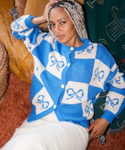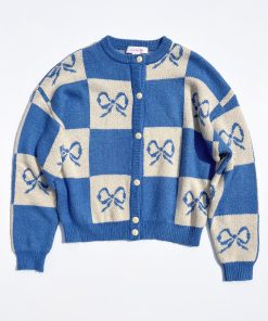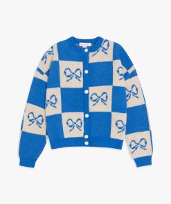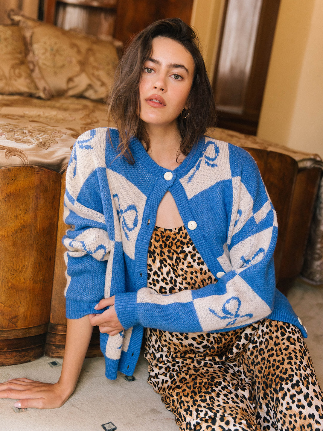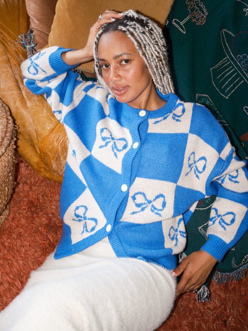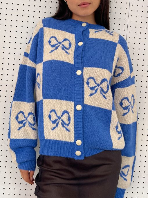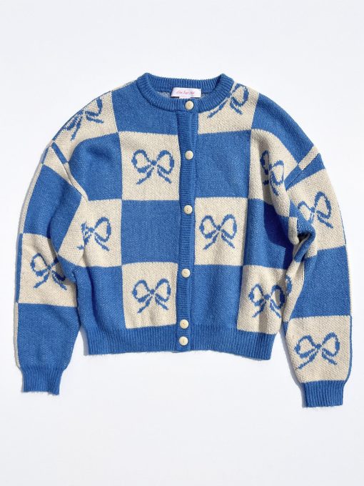 Slightly oversized soft wool blend cardigan in a white and blue check print with bows.