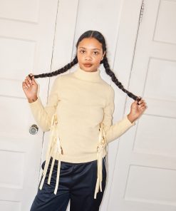 The Leona Sweater is a turtle neck sweater in a gorgeous light yellow knit, featuring ribbon bow details ascending up the bottom of the sweater to the inner-sleeve.