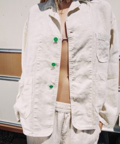 Boxy chore jacket made in a 100% linen, in a natural beige shade. Designed and manufactured in Los Angeles and features neon green buttons and plenty of pockets for versatile wearing.