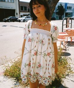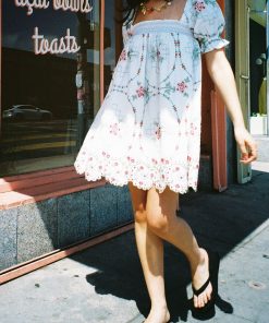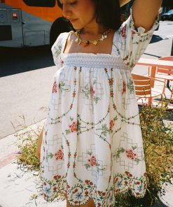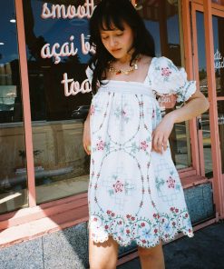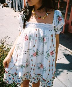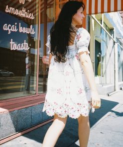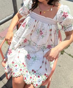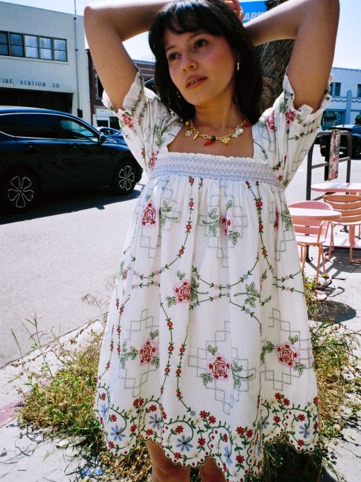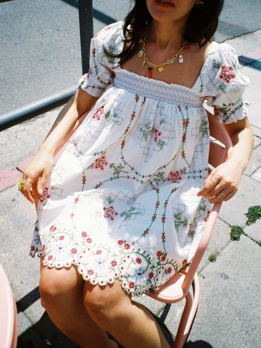 Crafted with an all over rose embroidery design and puff sleeves, the Lulu Mini Dress from Damson Madder is flirty and fun.