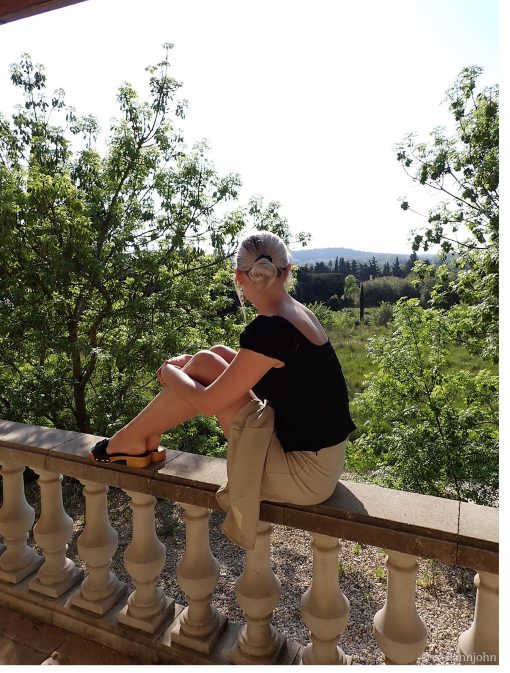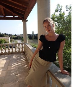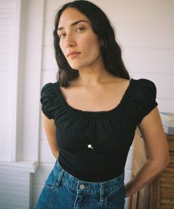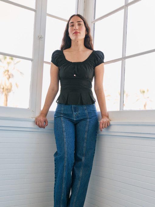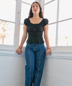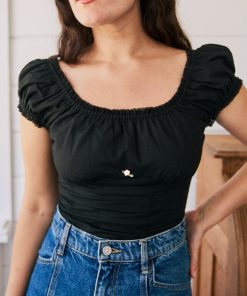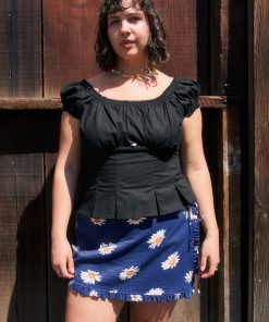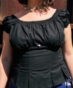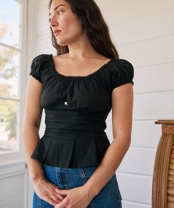 Cotton blend corset-style blouse with a sweet elasticized neckline and a ruched short sleeve for a puff-sleeve effect. This blouse has a flattering pleat at the bodice and a hidden zip closure at the side. This top runs a bit small.