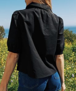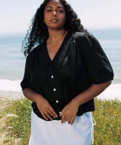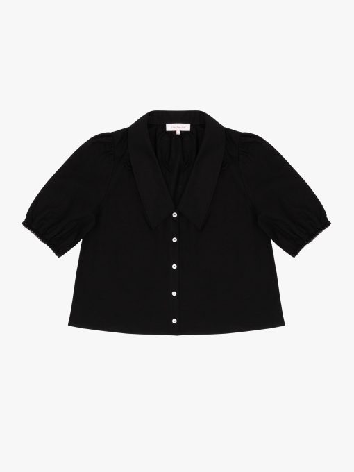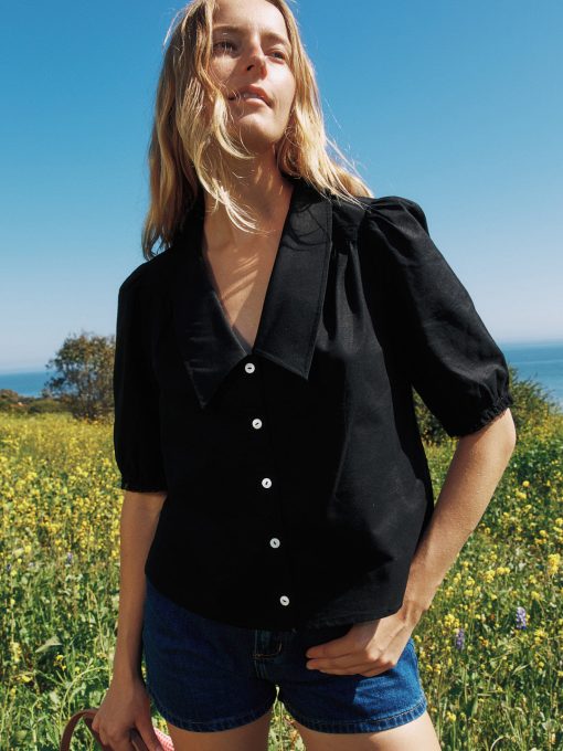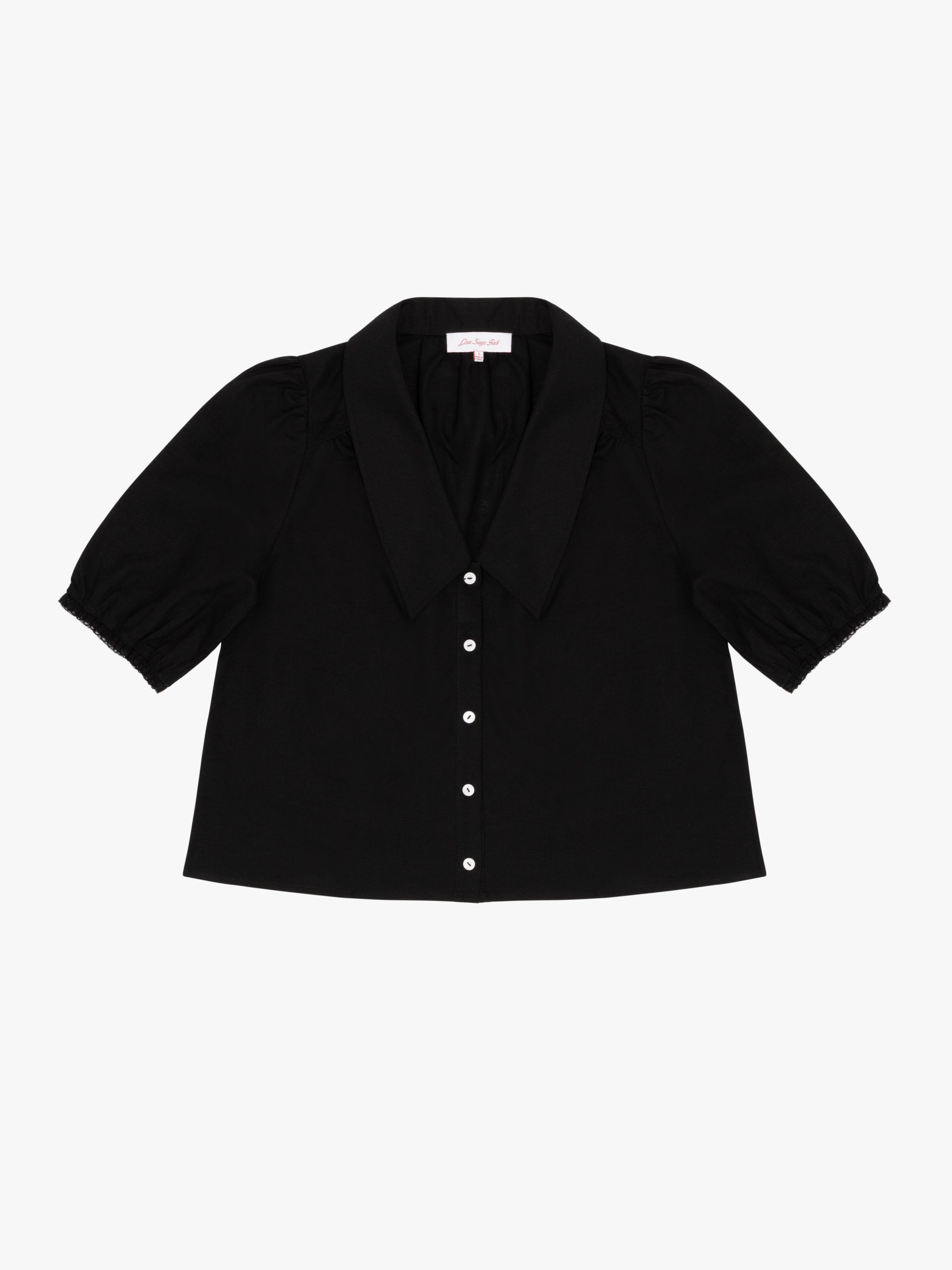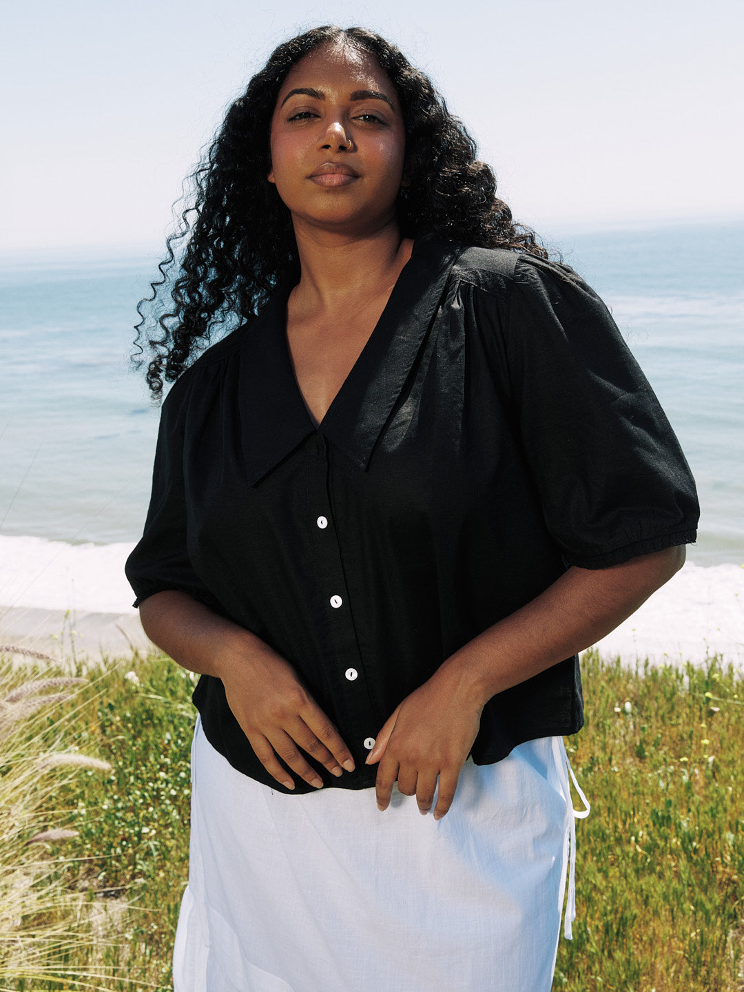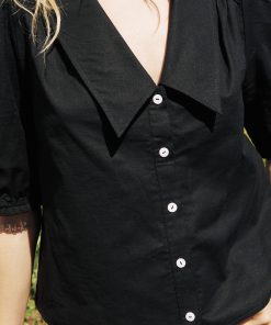 Boxy linen button up featured in a black linen/cotton blend with a dramatic pointed collar design and an elasticated sleeve opening for a comfortable fit.