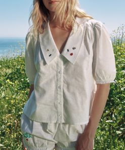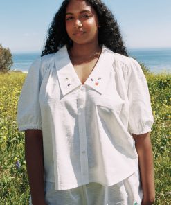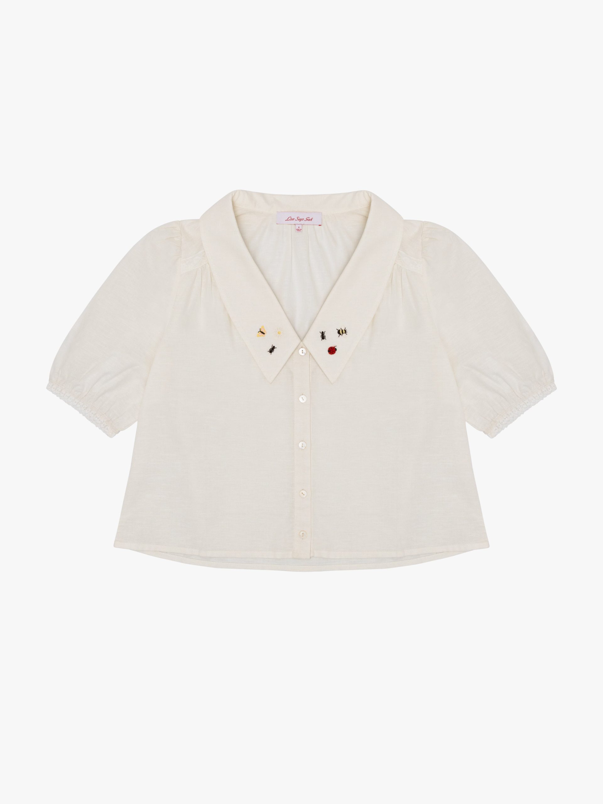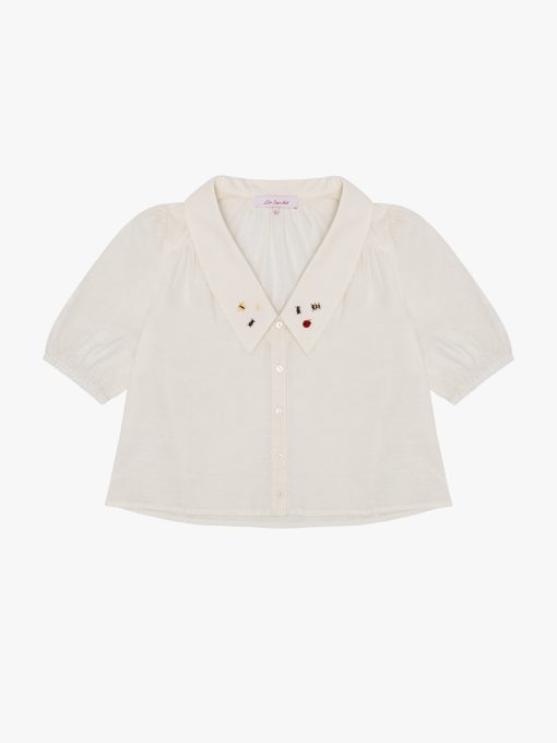 Boxy linen button up featured in a white cotton/linen blend with a dramatic pointed collar design and an elasticated sleeve opening for a comfortable fit.