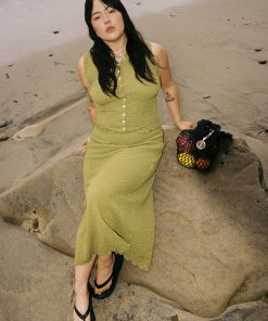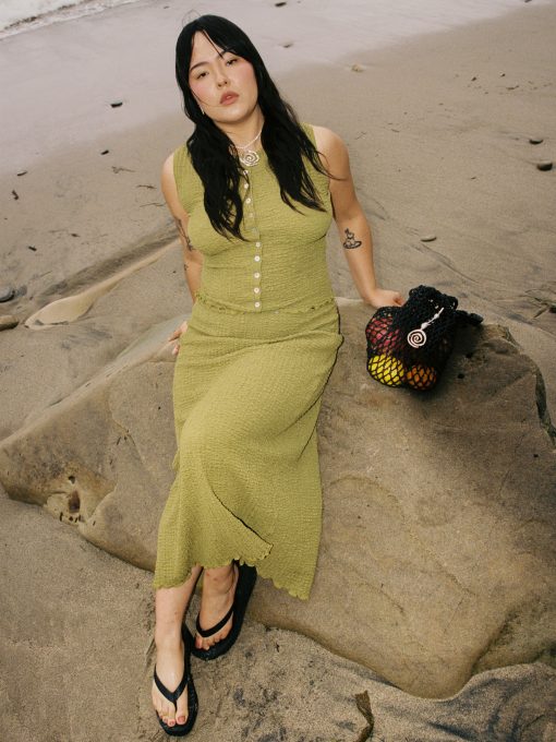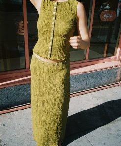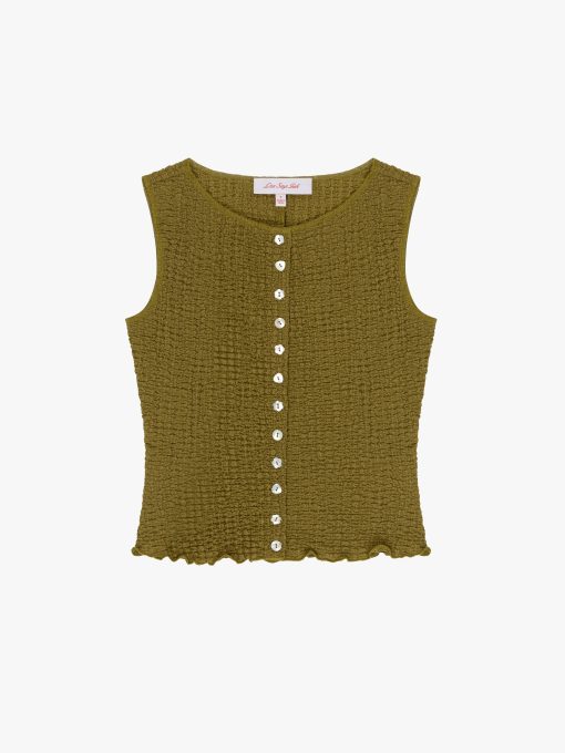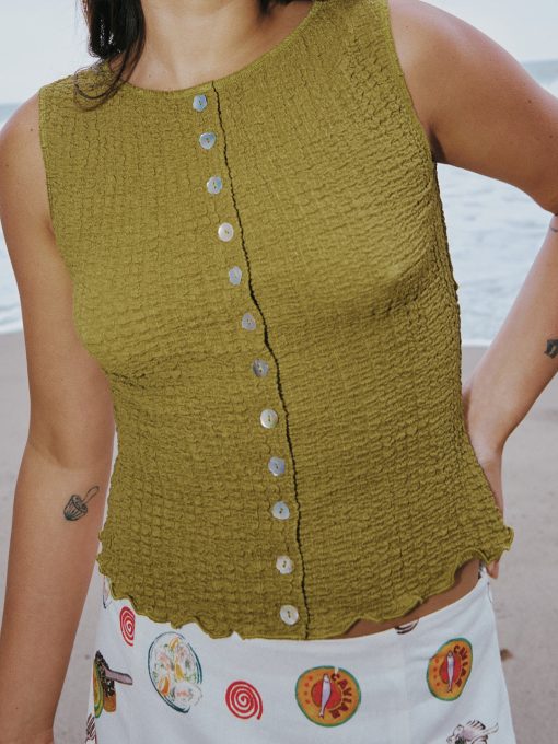 This is a sleeveless, olive green top made with a crinkle knit fabric. It has a round neckline and shell buttons down the front. The hem is slightly ruffled, and the fit is stretchy and snug. We recommend sizing up if you are between sizes.