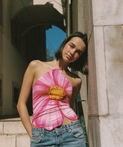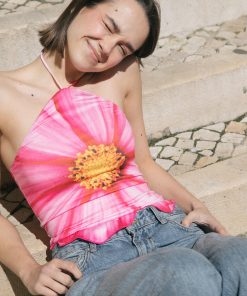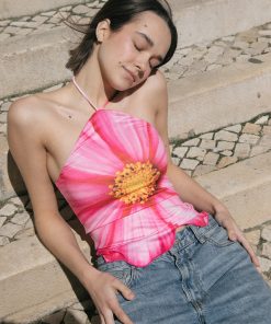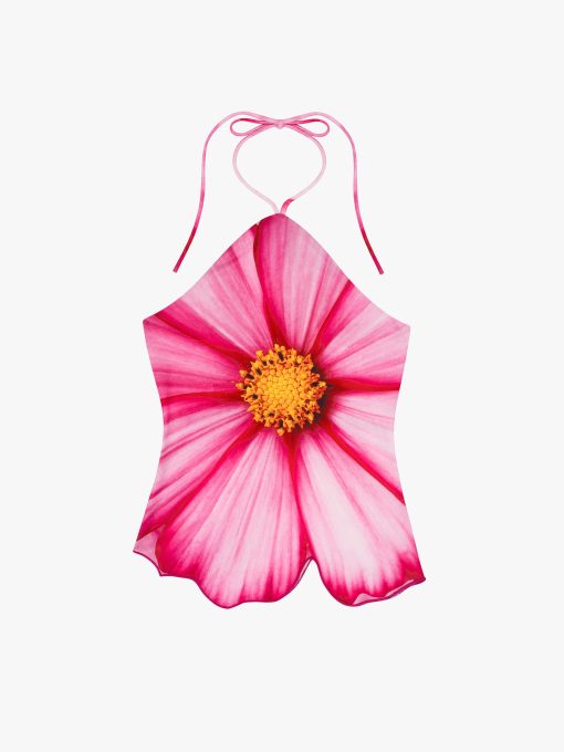 Pink halter top featured in a fun and realistic flower print. Scalloped at the hem for a petal-effect.