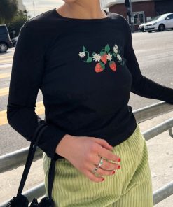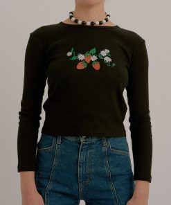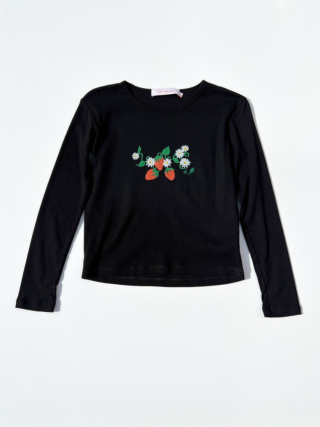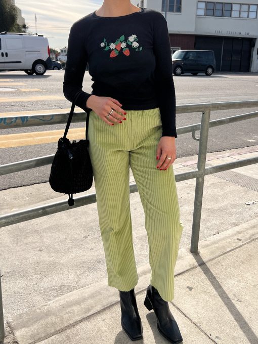 🍓Gah! The Dana is such a closet staple. A fitted cotton long sleeve tee with a cropped body and the most adorable strawberry print at the chest. Made from deadstock rib fabric sourced locally in LA.