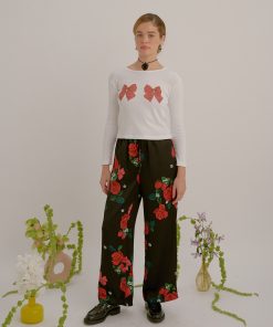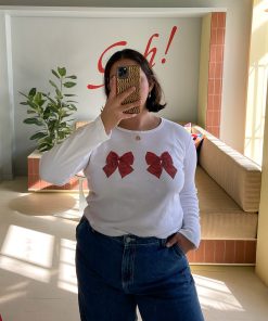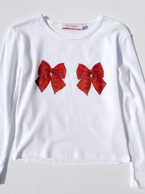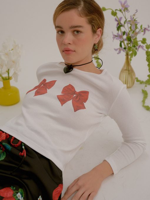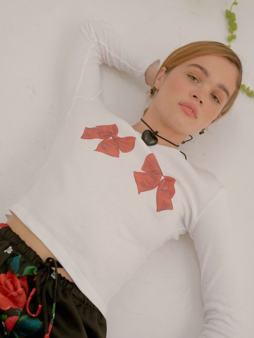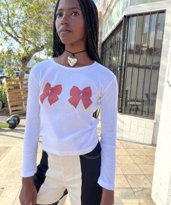 🎀Gah! The Dana is such a closet staple. A fitted cotton long sleeve tee with a cropped body and the loveliest ribbon bow print. Made from deadstock rib fabric sourced locally in LA.