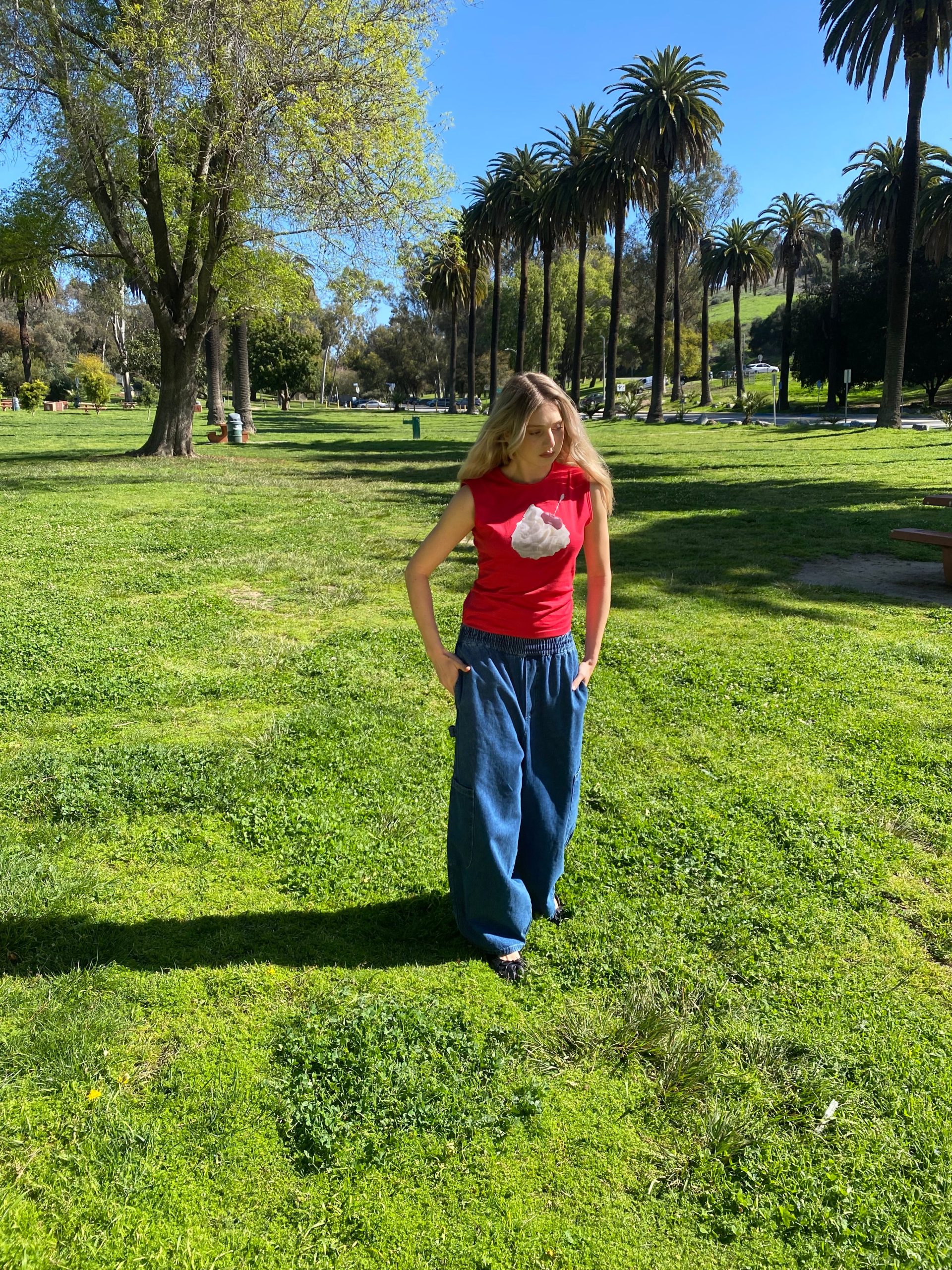 Crewneck tank top featuring a lenticular cherry whipped cream patch.